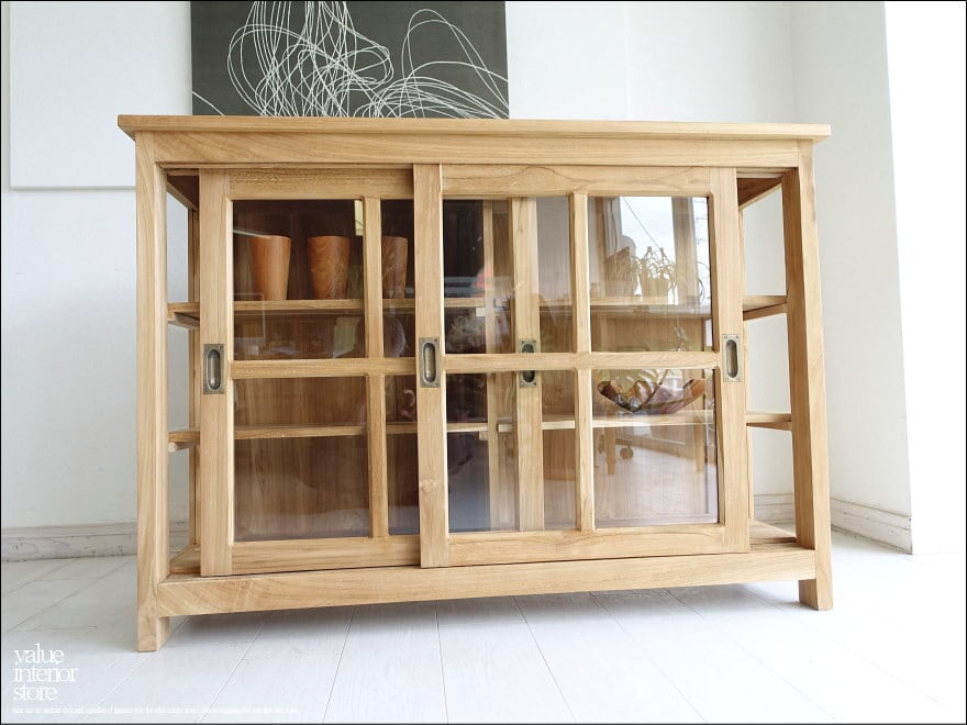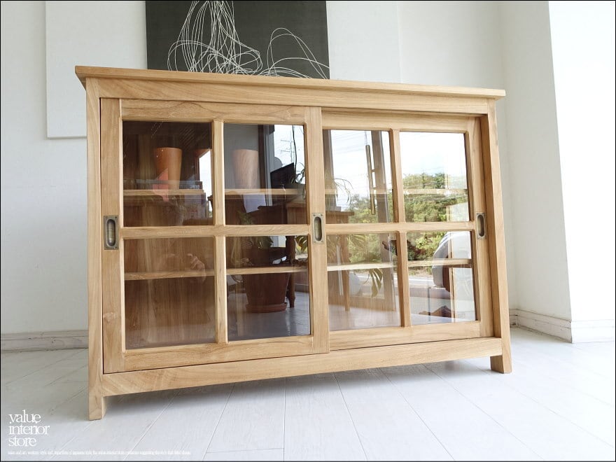 チーク総無垢材で贅沢に仕上げた使い勝手の良いスライド扉ガラスキャビネット。