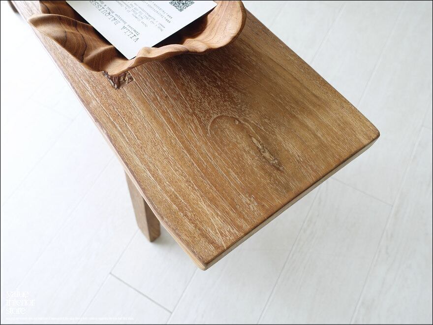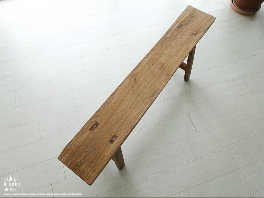 一枚板の座面は厚みもあり長くお使いいただけるしっかりした作りです。チークならではの木目と古材ならではの木肌が全体的に見られ味わい深く仕上がっています。職人さんが丹精こめて作った印象に溢れていて、きっとお部屋をスローダウンした素敵な雰囲気に包んでくれます。ベンチだけでなくインテリアのディスプレイ台としてもステキです。