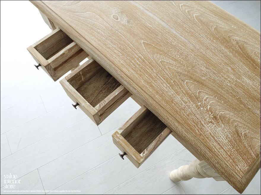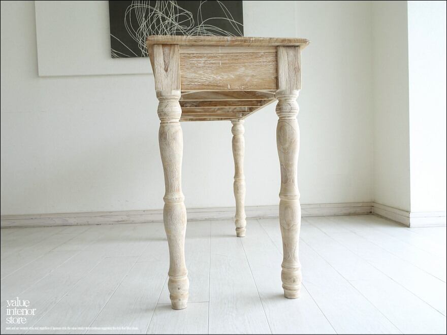 表面はワイヤーブラシで軽く削ってから白色を塗布した後に、紙やすりで再度表面を削る手法を用いていますので、シャビーな質感に仕上がっています。西洋、アジアン、和風モダン、北欧など幅広いテイストのインテリアと相性良くコーディネートできますのでお気に入りスペースでお使いください。