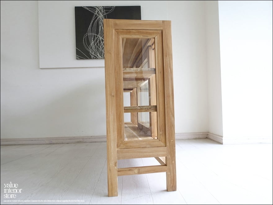 4面ガラス仕様で光が入りやすく、中に収納するものもディスプレイするような感覚で飾りたくなります。ナチュラルで個性的な木目が広がっており、チーク材の持ち味の硬さや張りの強さが感じられます。お店のショーケースとしてもぜひお使いください。