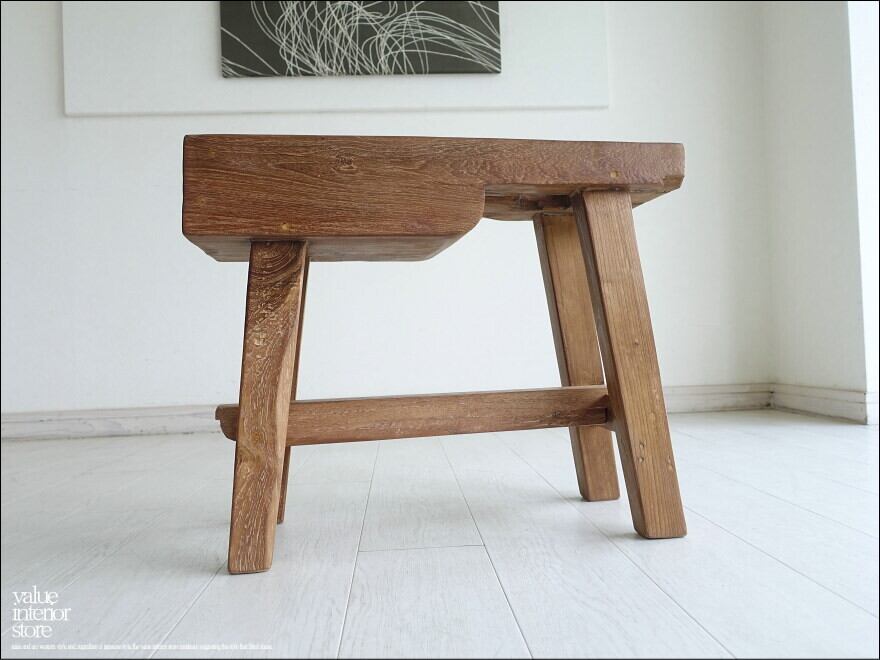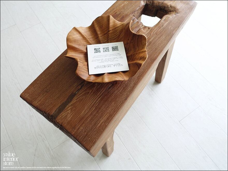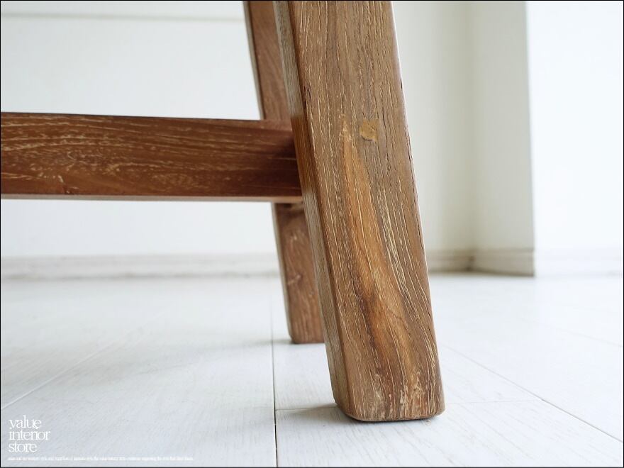 一枚板の座面は厚みもあり長くお使いいただけるしっかりした作りです。チークならではの木目と古材ならではの木肌が全体的に見られ味わい深く仕上がっています。職人さんが丹精こめて作った印象に溢れていて、きっとお部屋をスローダウンした素敵な雰囲気に包んでくれます。ベンチだけでなくインテリアのディスプレイ台としてもステキです。