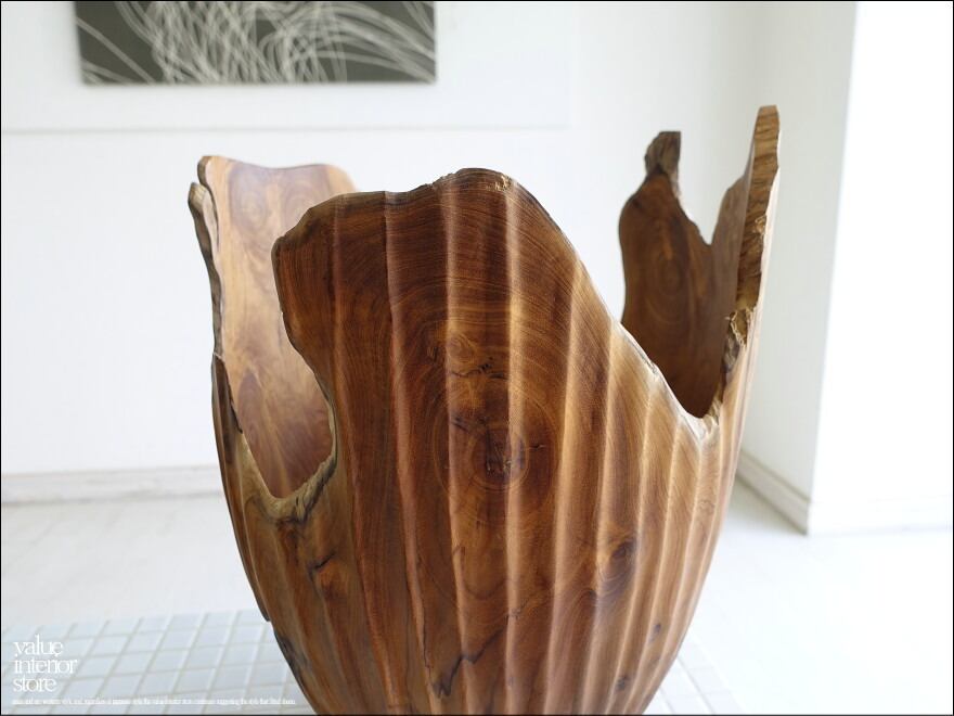 一本の丸太より削り出して製作する、自然な様の形と柔らかで変化に富んだ木肌が印象的なチーク総無垢材のプランツカバー。縦に入った37本のラインが底に近づくにつれてキュッと引き締まったデザインになっていて目を引きます。ここまで薄く製作ができますのも、張りを持つチーク材で乾燥状態に優れている素材だからこそのものです。