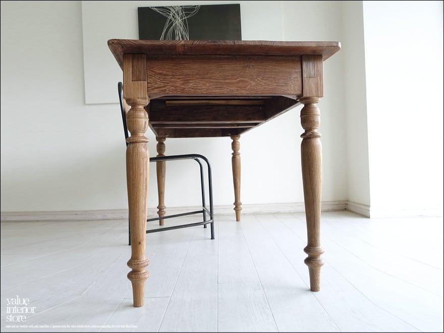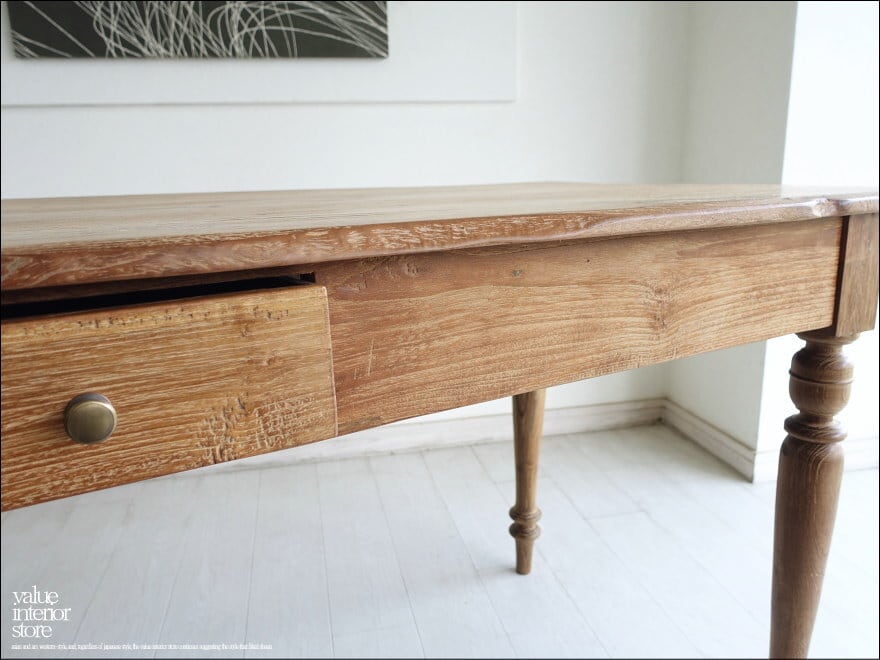 チーク材独特の色合いで、古いものならではの渋く落ち着いた質感から雰囲気が感じられます。とても存在感がありゆったりとしています。職人さんが丹精こめて作った印象に溢れていて、このデスクに向かうと自然と気持ちまで落ち着くようです。西洋、アジアン、和風モダン、北欧など幅広いテイストのインテリアと相性良くコーディネートできますのでお気に入りスペースでお使いください。
