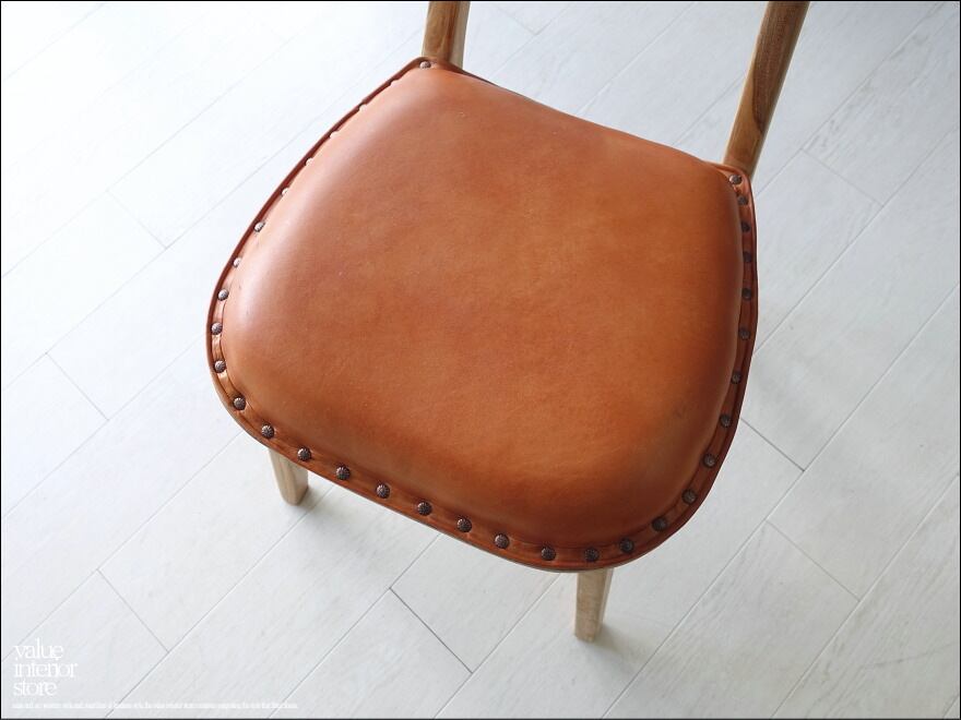 チーク無垢材のナチュラルな木肌が魅力的な一人掛けのレザーチェア。ライトブラウンの本皮を真鍮製のスタッズ(鋲)が丁寧に打ち込まれています。(*発送前に全体に天然オイルを軽く塗布いたします。)