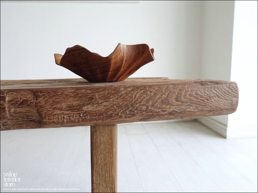 オールドチークならではの味のある雰囲気が魅力的なベンチ。一枚板の座面は厚みがあり長くお使いいただけるしっかりした作りです。チークならではの荒々しさと、古材ならではの変化に富んだ木肌が全体的に見られ味わい深く仕上がっています。職人さんが丹精こめて作った印象に溢れていて、きっとお部屋をスローダウンした素敵な雰囲気に包んでくれます。ベンチだけでなくインテリアのディスプレイ台としてもステキです。