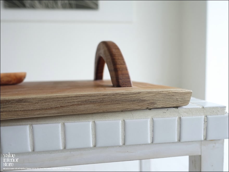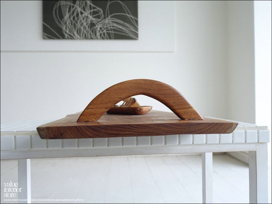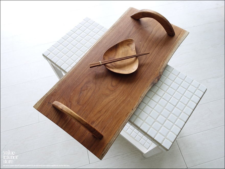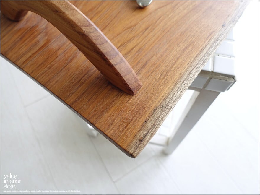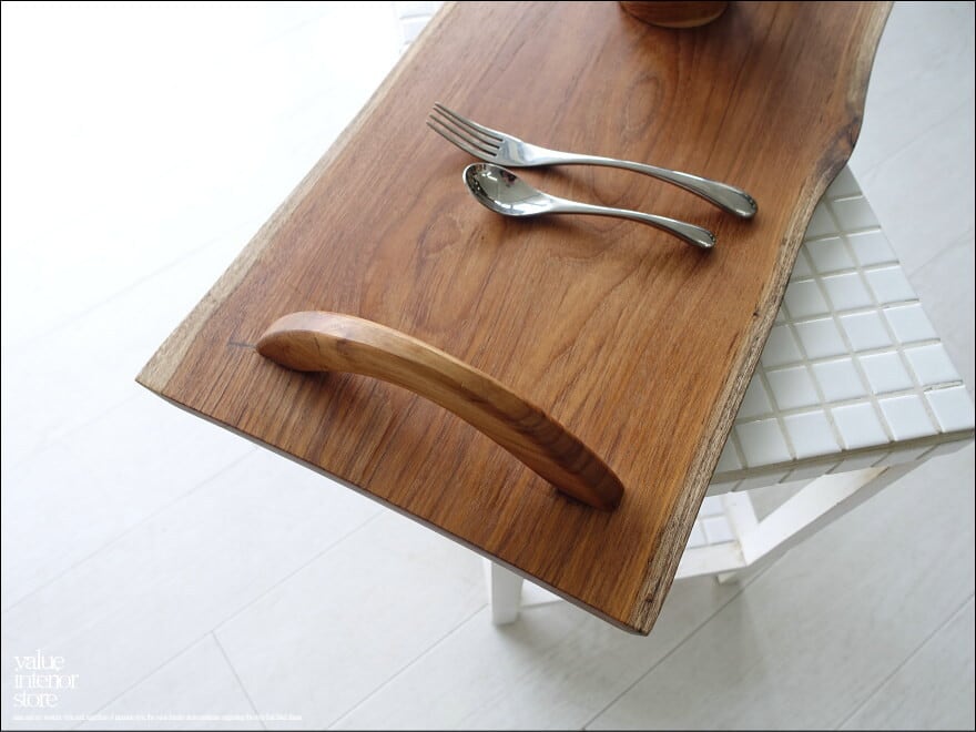 ナチュラルなチーク材の変化に富んだ形と木目が素敵なサービングトレイ。