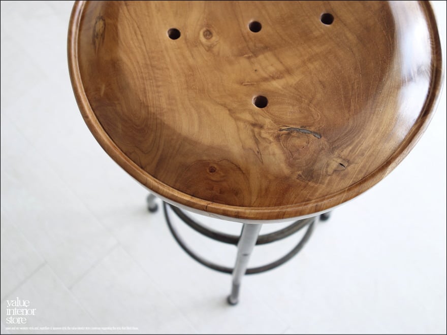 チーク鉄脚バースツール円 イス 椅子 チェア アイアン 木製 インダストリアル レトロ調 無垢 鉄フレーム ナチュラル 工業系 銘木 天然木