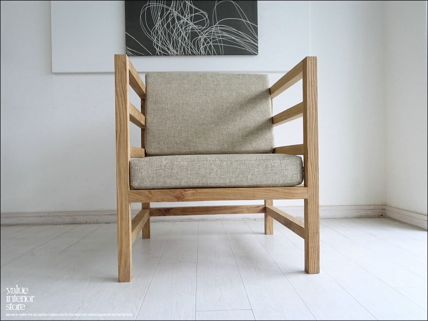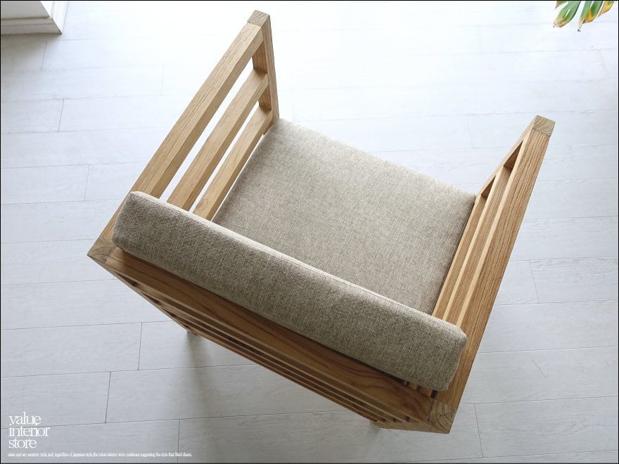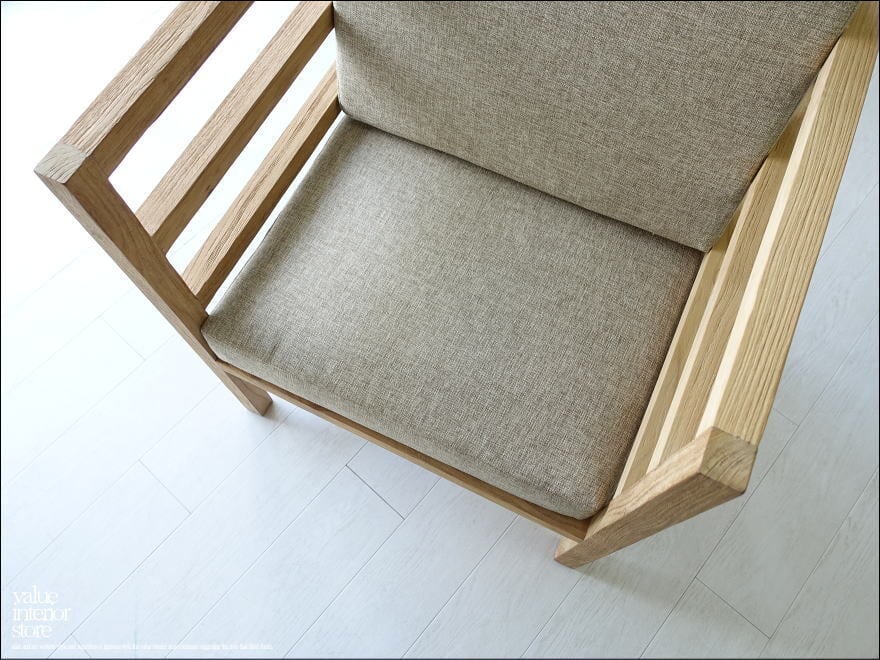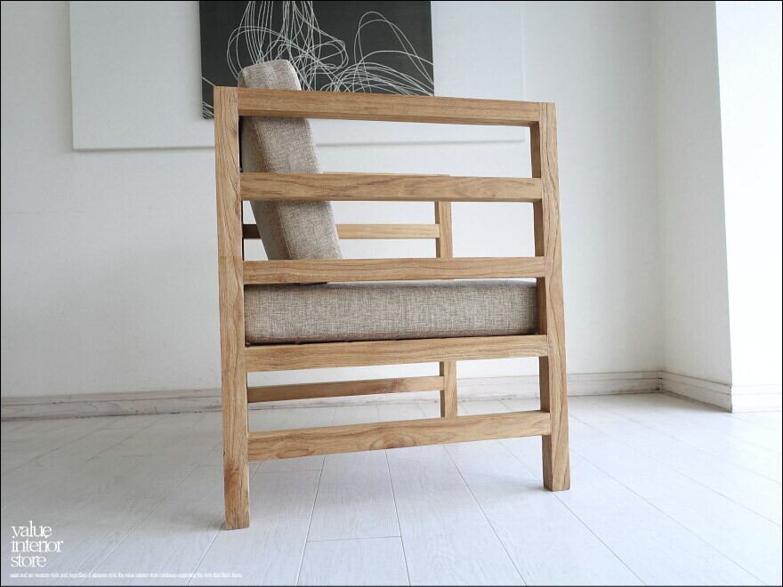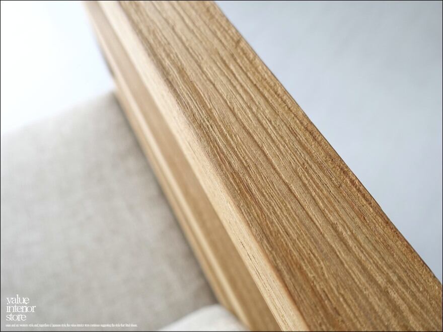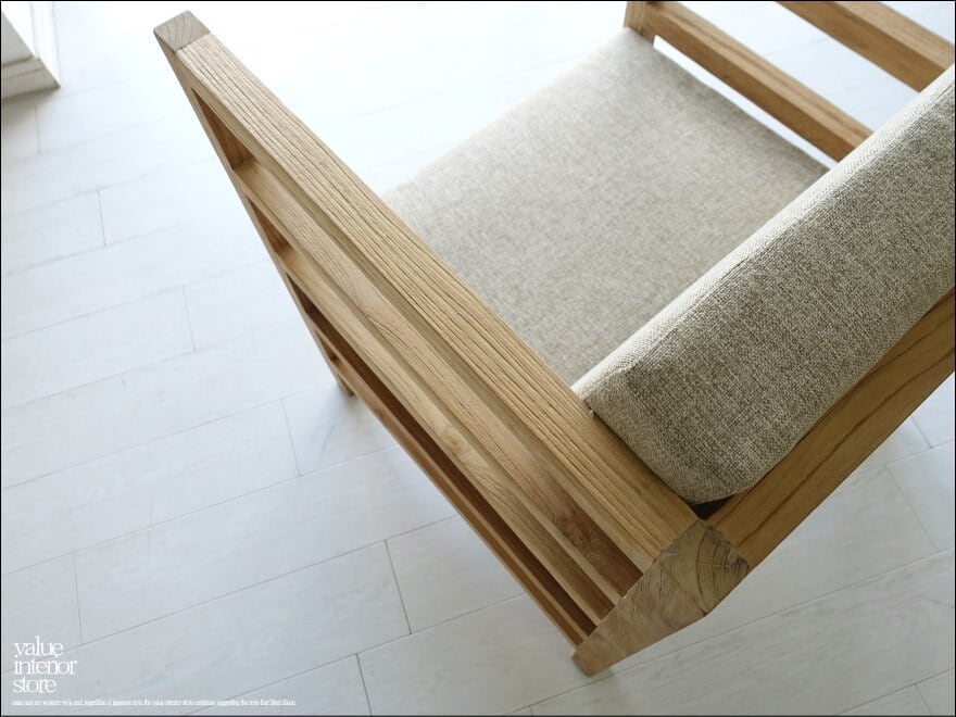 全体のデザインもフレームも細く直線的でシンプルに仕上げたチーク無垢材×ファブリックのシングルソファ。無垢材の表面は凹凸をつける表面仕上げにより一層ナチュラルで素朴な雰囲気に仕上がりました。長くリラックスしてお座りいただける適度な硬さのクッションを載せたソファは、腰に負担を抑える様に多少硬さを持たせた弾力性のあるウレタン素材を使用しています。