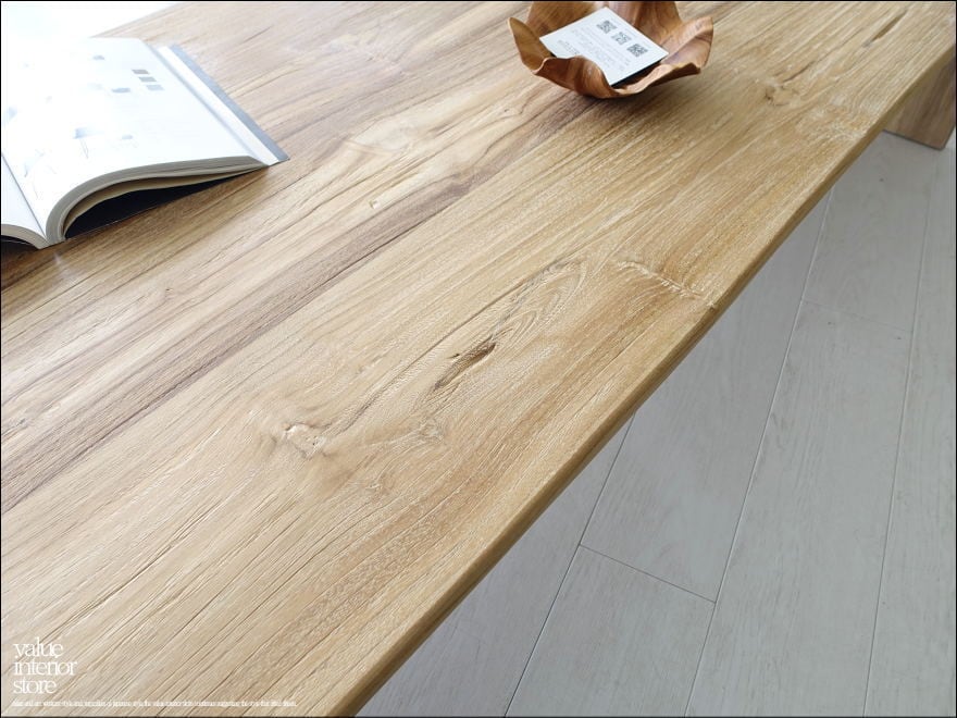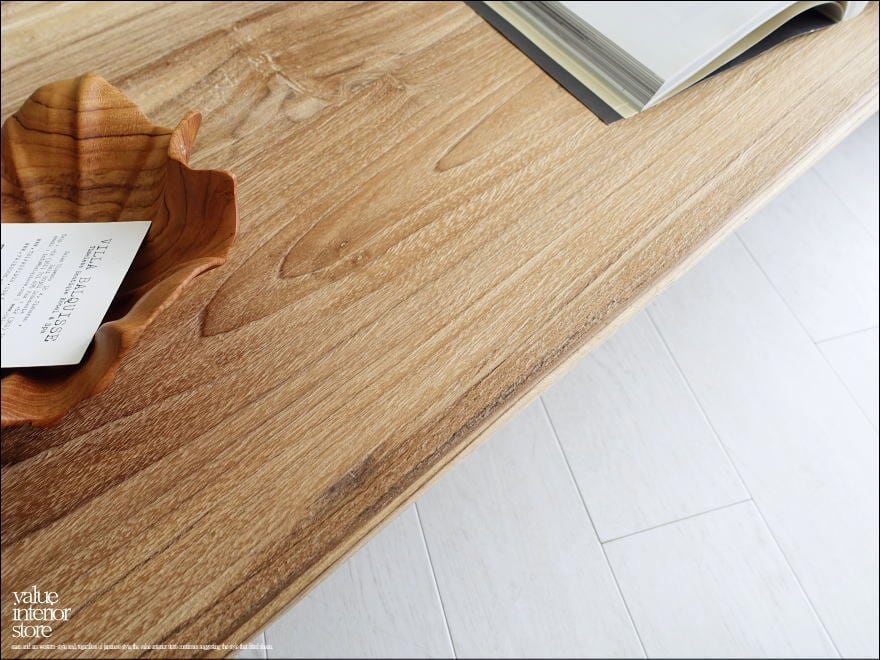 一目見ただけで品質の良さを木肌から感じ取れるオールドチーク無垢材のリビングテーブル。飾りのないシンプルな脚は、天板からそのままストンと床に下ろしただけのデザインで、個性的な木目と油分を含むチーク材独特のコントラストのある表面を全面から感じていただけます。おくつろぎをいただくお部屋の中心となるリビングで、落ち着きのある雰囲気をぜひお楽しみください。