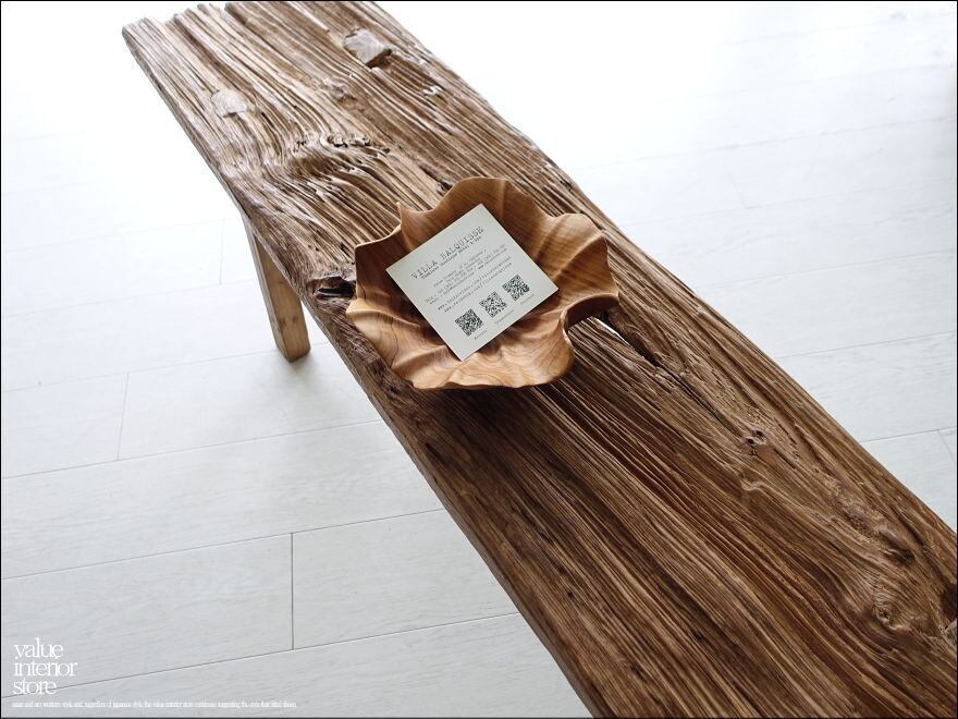 オールドチークならではの味のある雰囲気が魅力のベンチ。一枚板の座面は厚みもあり長くお使いいただけるしっかりした作りです。チークならではの荒々しさと、古材ならではの変化に富んだ木肌が全体的に見られ味わい深く仕上がっています。職人さんが丹精こめて作った印象に溢れていて、きっとお部屋をスローダウンした素敵な雰囲気に包んでくれます。ベンチだけでなくインテリアのディスプレイ台としてもステキです。