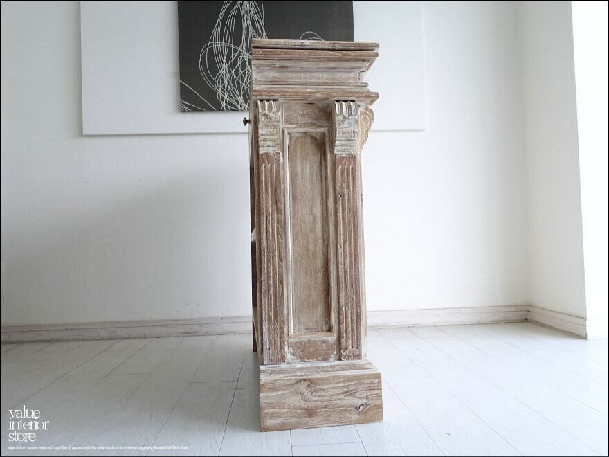 表面はチーク材の美しい木目と質感を感じていただけます。カウンターテーブル、飾り台としてお使いください。引出しの取っ手には、大きめの無垢の真鍮ハンドルを使用しました。表面は凹みにわずかに入った白色がシャビーで素朴な印象を感じられます。雑貨店や美容室のレジ台にもどうぞ。