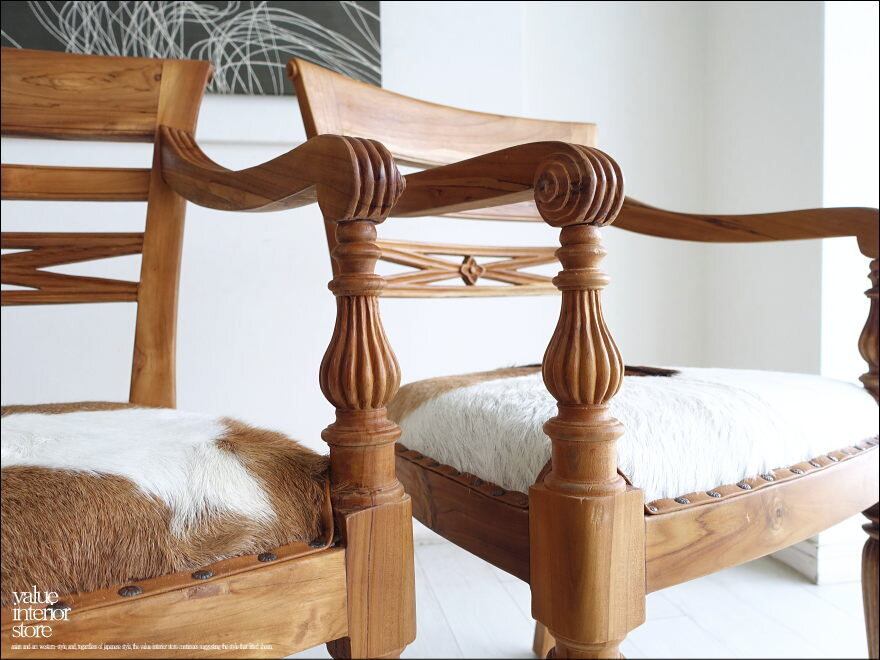 チークの味のある風合いが魅力のウッドフレームに、高級感のある毛皮付きレザーを座面を独特なスタッズで打ち、置いてあるだけでも存在感のあるチェア。