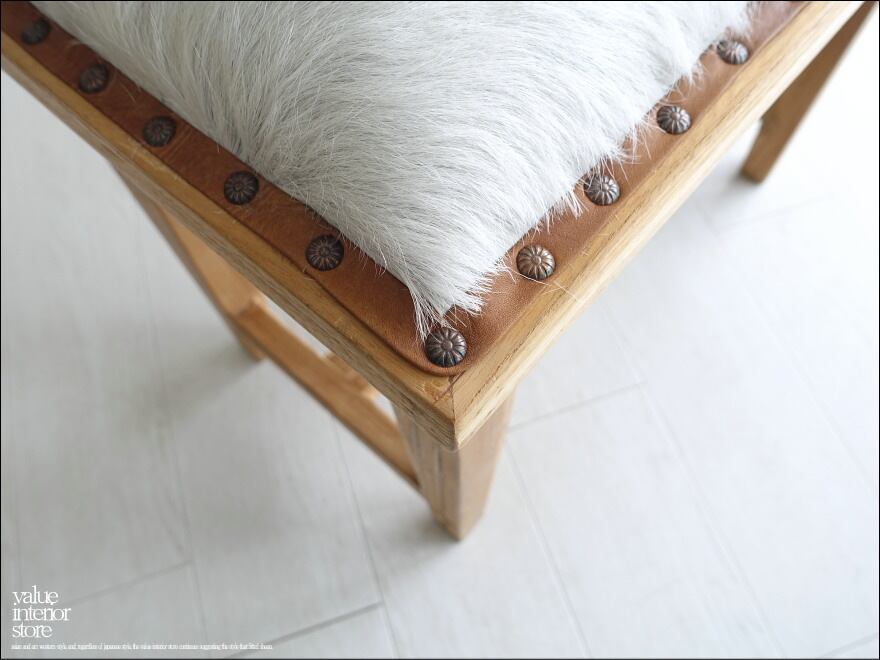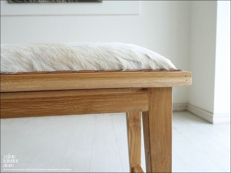 オールドチークの味のある風合いが魅力のウッドフレームに毛皮付きレザーを独特なスタッズで打ち、置いてあるだけでも存在感のあるベンチ。