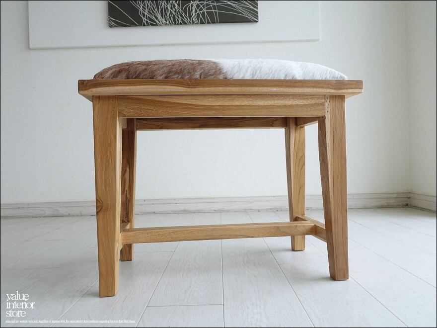 レザーベンチFUR18 シングルソファ スツール オットマン 毛皮張り 本皮 イス 無垢 古材家具 レザー張りベンチ オールドチーク ida