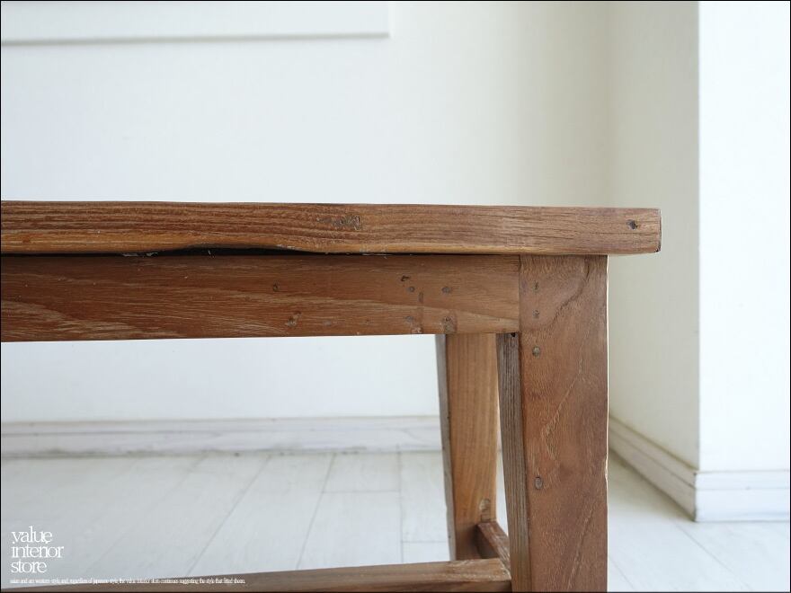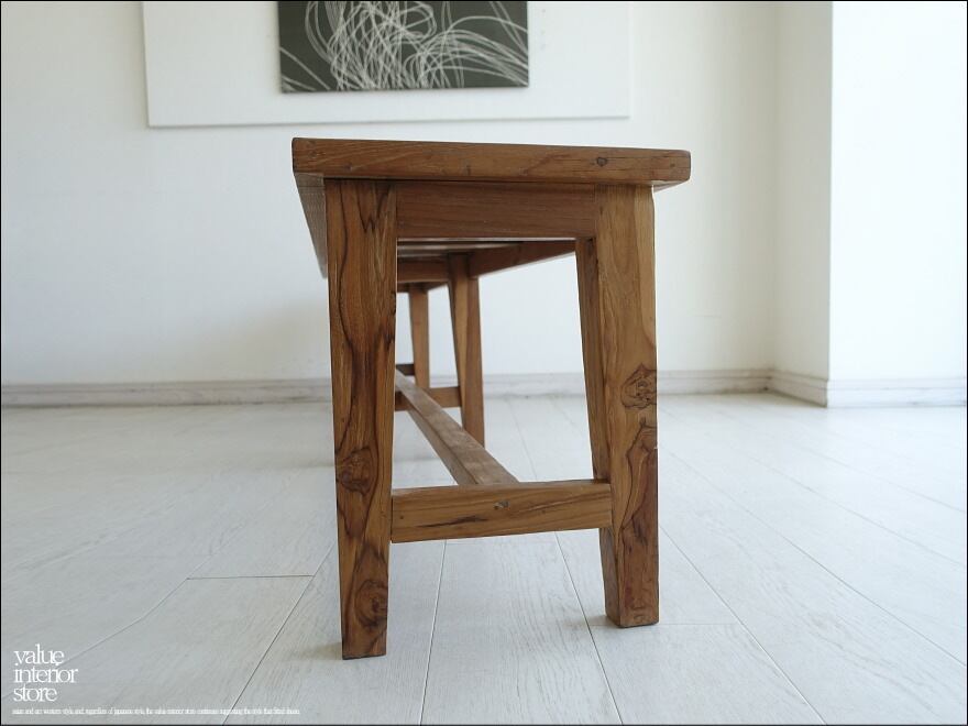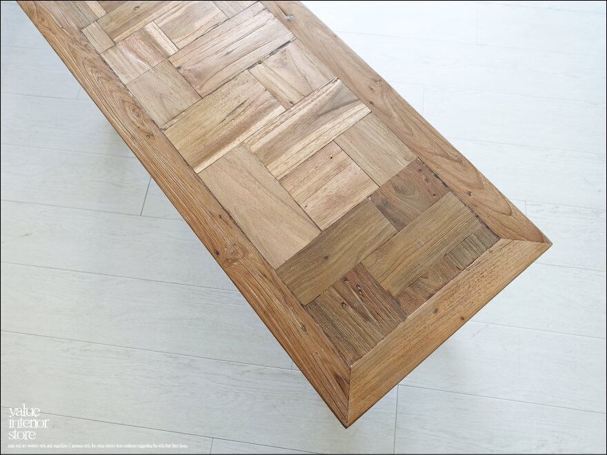 オールドチークならではの味のある雰囲気が魅力のベンチ。タイル状に端材を組み合わせたデザインが素敵です。チークならではの荒々しさと、古材ならではの変化に富んだ木肌が全体的に見られ味わい深く仕上がっており、きっとお部屋をスローダウンした素敵な雰囲気に包んでくれます。ベンチだけでなくインテリアのディスプレイ台としてもステキです。